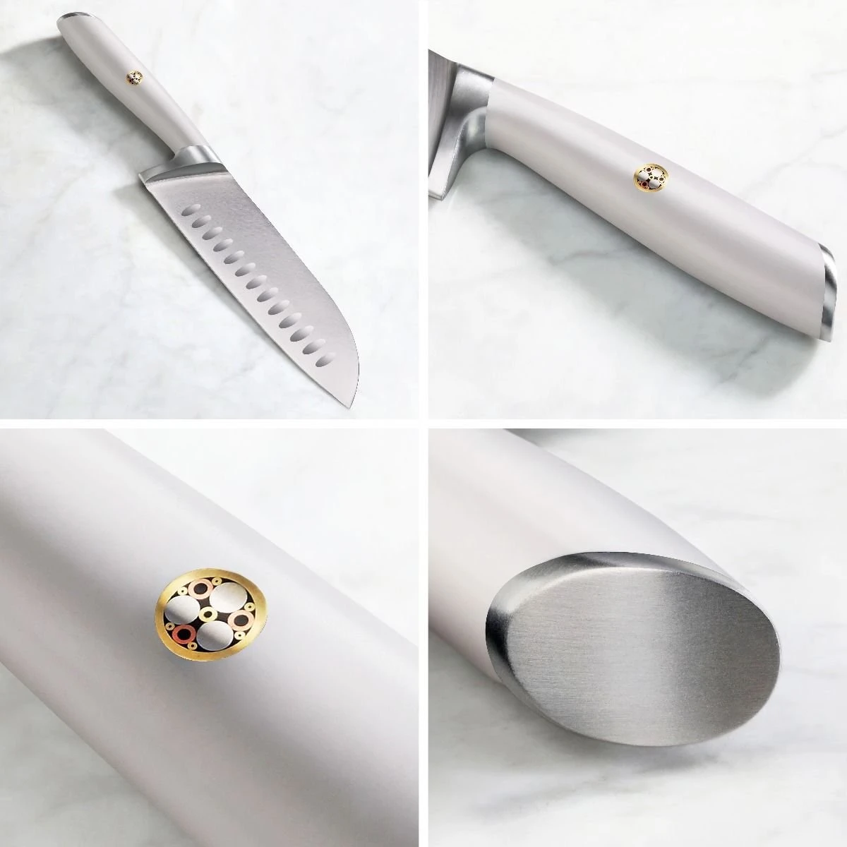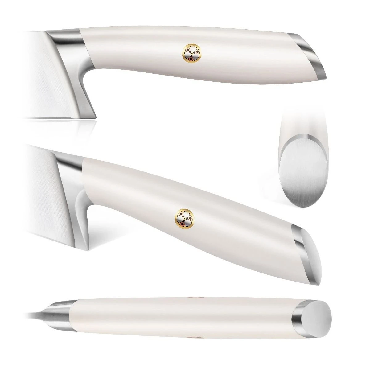 - Ergonomic polymer handle in sleek, minimalist white