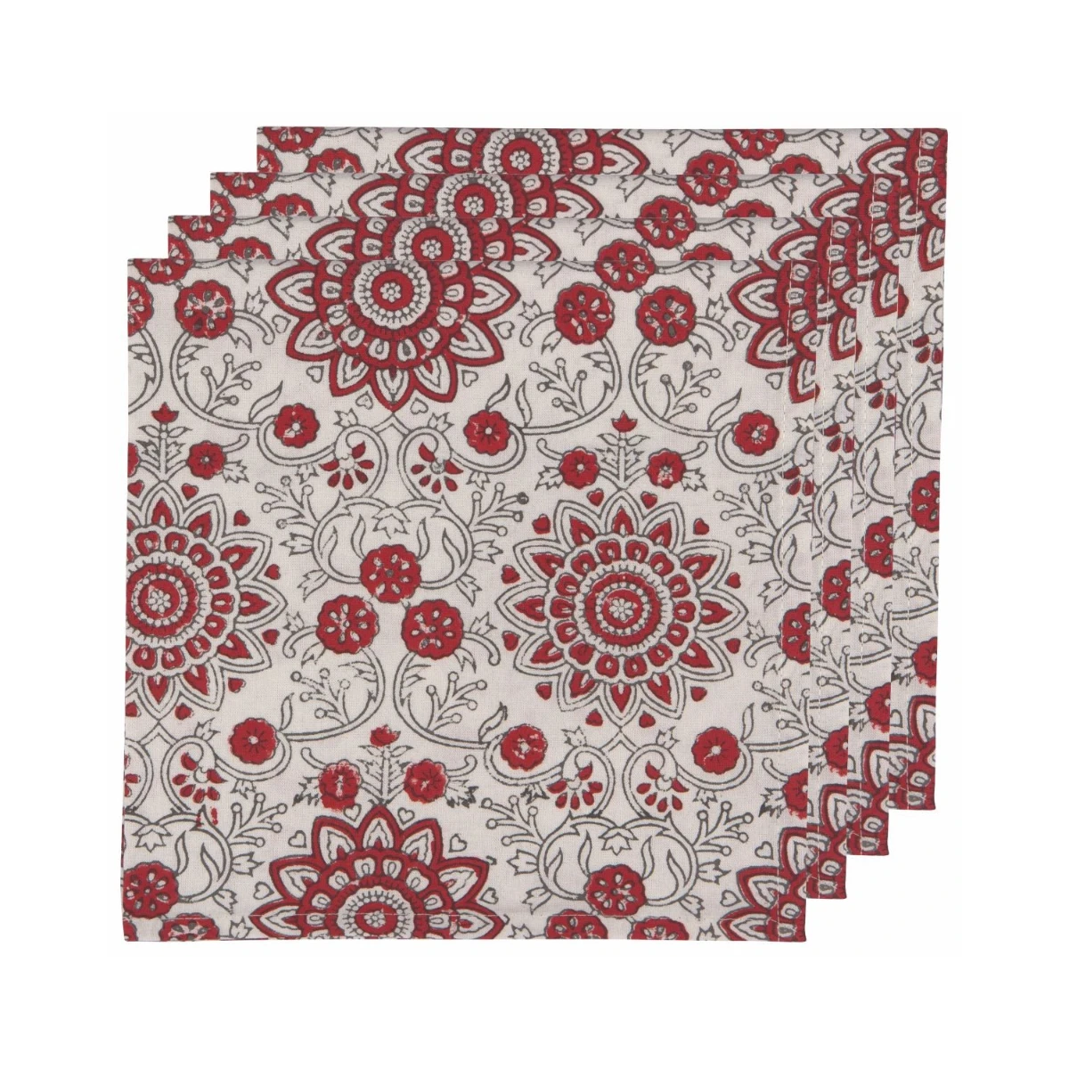 There are certain occasions in life where what you put on the table is just as important as the food you place on it. Such moments call for 100% cotton, machine washable, Danica Heirloom Block Print Napkins. Block printing, a skilled artisan craft passed down from one generation to another, applies ink to the fabric via hand-carved wooden block, allowing the craftsmanship and unique variation of each napkin to shine through. When paired with the matching tablecloth and complimentary table accents, these cream 18-inch square napkins bloom with rich crimson, making a garden come to life in a classic Passionflower floral tile design that provides a vibrant touch for your guests’ comfort and pleasure.