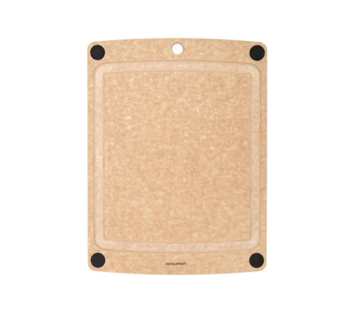 Simplify kitchen prep with a cutting board that can do it all! Epicurean gathered the best features of their most popular boards and combined them into this 14.5” x 11.25” All-In-One Board. This cutting board has a generous juice groove on one side and is smooth on the other, it has non-slip feet in the corners, and it’s as thin as Epicurean’s popular Kitchen Series cutting boards (only ¼”). Like all of Epicurean’s cutting boards, this one is made of a wood-fiber material that won’t crack or split, is knife-friendly, and heat-safe to 350°F. Because it’s non-porous, it won’t ever harbor bacteria, so you can safely use it to slice raw chicken into strips tonight, and then serve cheese and charcuterie on it tomorrow. Simple, functional, and built to last; this multi-tasking board is a kitchen essential.