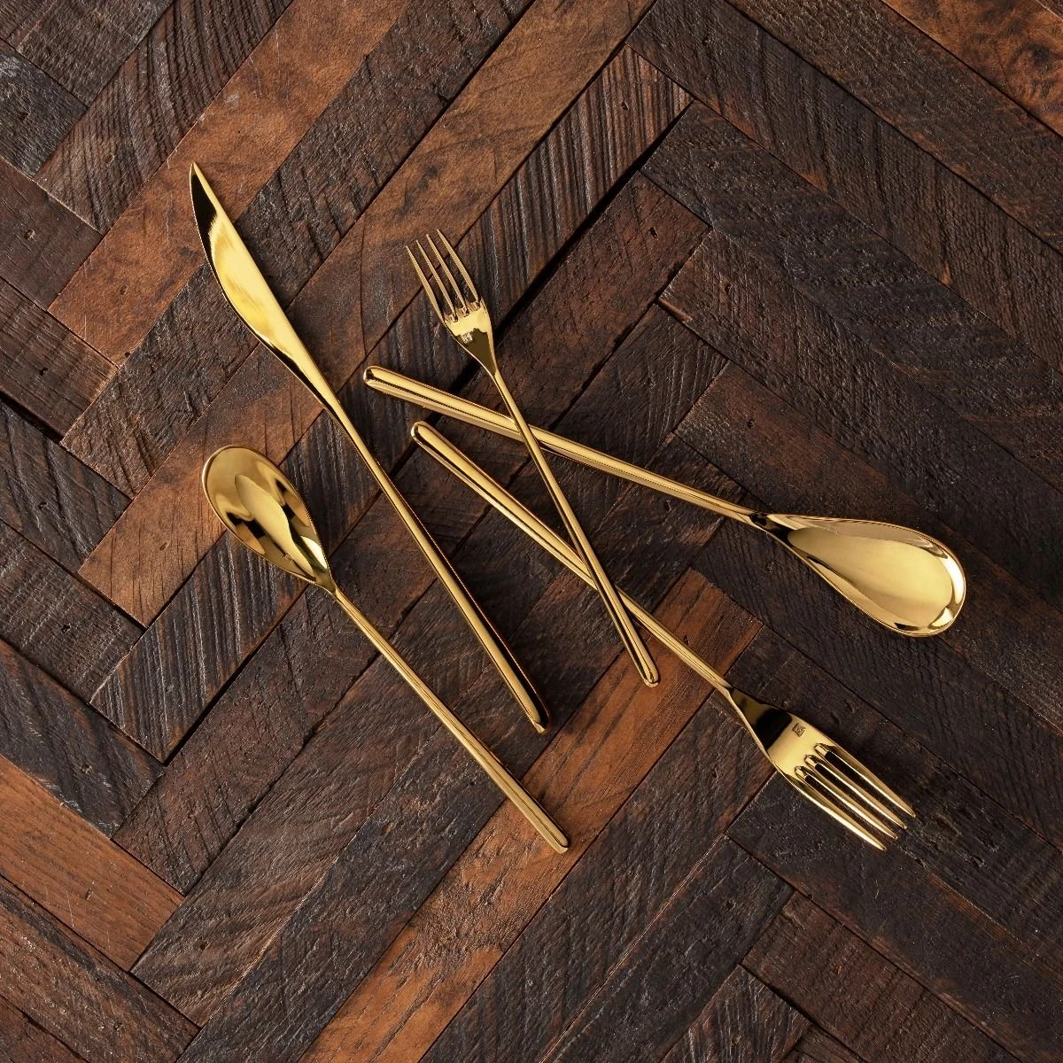 Make a statement with the Fortessa Dragonfly 5pc Place Setting in Gold! This stunning flatware set features a unique slender design and mirrored gold finish that draws the eye. Two droplet-shaped spoons, two sleek forks, and a delicately-sloped knife make up this set, all with elongated round handles. These sophisticated pieces have the perfect amount of heft and balance, making them feel high-quality and comfortable to use. Made from 18/10 stainless steel, this flatware set is dishwasher-safe. Whether you’re hosting a party, setting up a dinner date, or serving yourself, add functional beauty to the table with the Fortessa Dragonfly 5pc Place Setting in Gold!