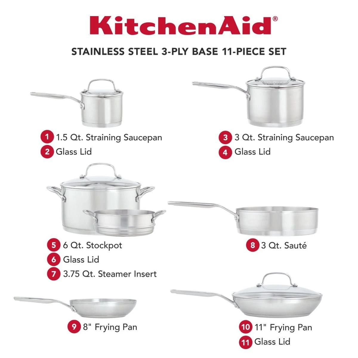 KitchenAid Stainless Steel 3-Ply Base 11-Piece Cookware Set Features: