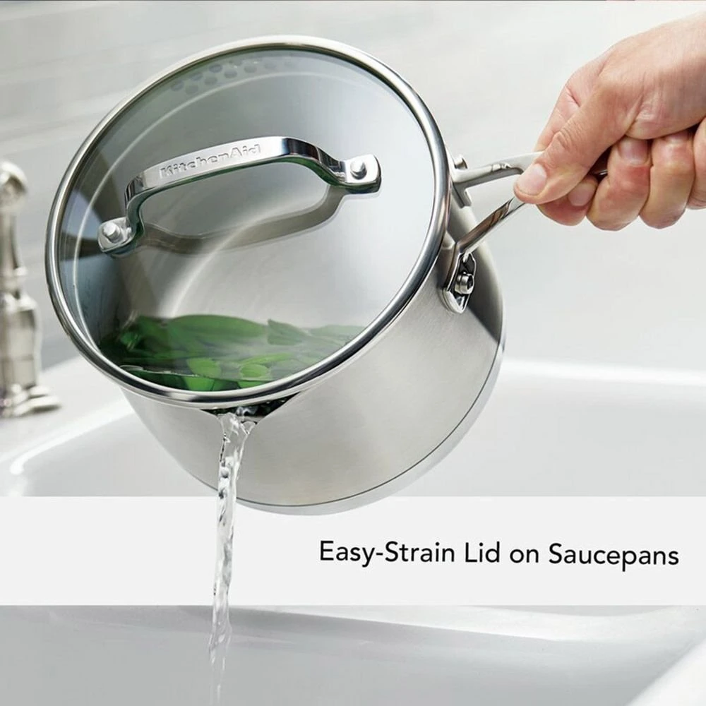 Constructed from high-quality 18/10 stainless steel, the 3-Ply Base 11-Piece Cookware Set from KitchenAid has a thick layer of heat-conducting aluminum sandwiched between two layers of stainless steel in the base for excellent edge-to-edge heat conductivity. Quickly sear meat, sauté vegetables, and reduce sauces on your way to making delicous meals on any stovetop, including induction. Volume measurements etched inside the saucepans and stockpot make it easy to measure ingredients, while all the pans and tempered-glass lids are dishwasher-safe to simplify cleanup and care. The lids for the two saucepans have built-in strainer rims so you can easily strain off liquid without the need for a standalone strainer. The cookware is oven-safe to 500ºF without the lids (350ºF with lids) making this 11-Piece Cookware Set as versatile as it is durable for everyday kitchen use.