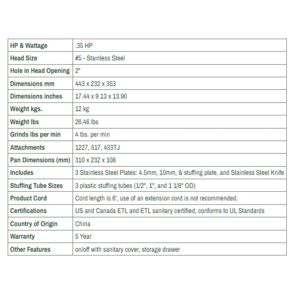 - Stainless steel motor housing, head, auger, knife & meat pan