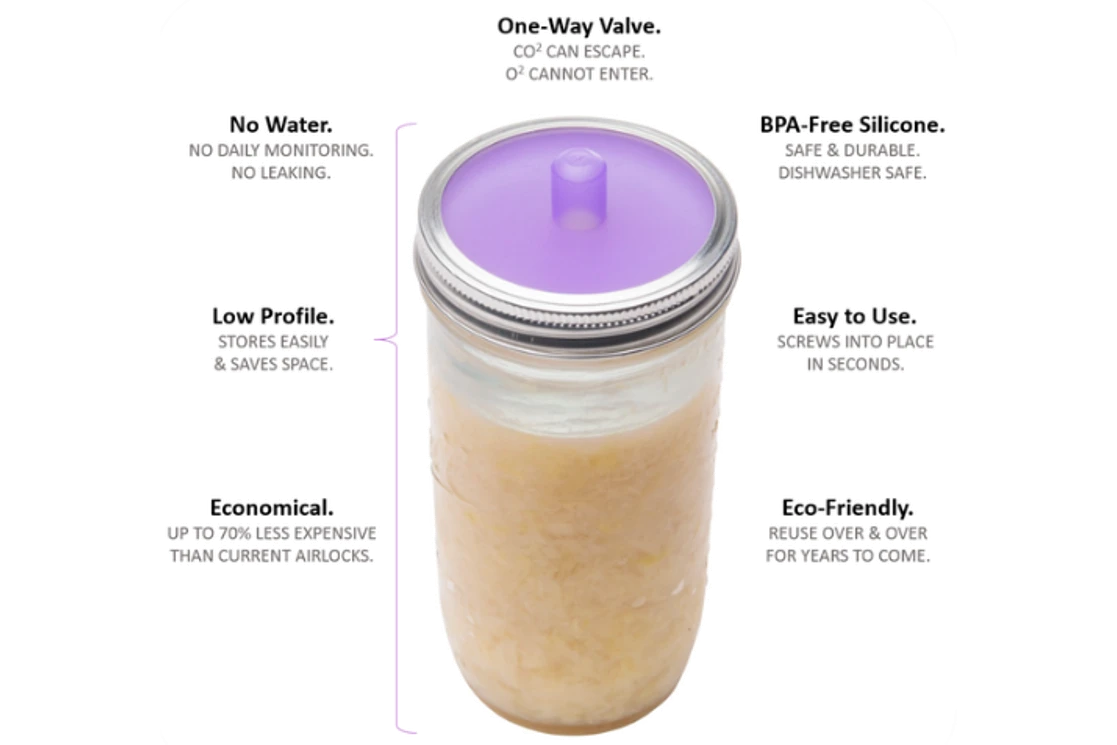 Gather fresh produce from the grocery store, farmer’s market, or from your very own garden for sauerkraut, kimchi, or pickled vegetables made possible by your new Masontops Regular Mouth Fermentation Pickle Pipes – Set of 4! This set includes 4 pickle pipes in light blue, blue, lavender, and red. The pickle pipe serves as a silicone airlock that fits onto any standard mason jar band. It is FDA food-grade approved and dishwasher safe. The pickle pipe has a specialized one-way valve in the center that only allows gas to exit the jar once enough pressure builds up inside. It will not allow oxygen or anything else to enter the jar, eliminating the risk of mold. You can leave your fermenting vegetables to sit indefinitely, so you do not have to worry about constantly checking on it. Invest in your very own Masontops Regular Mouth Fermentation Pickle Pipes and easily ferment vegetables like cabbage into sauerkraut with minimal effort!