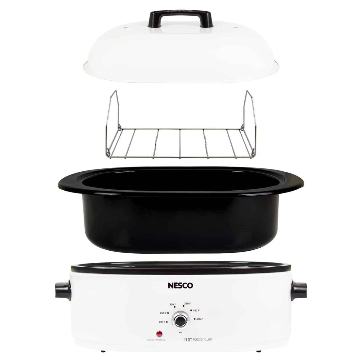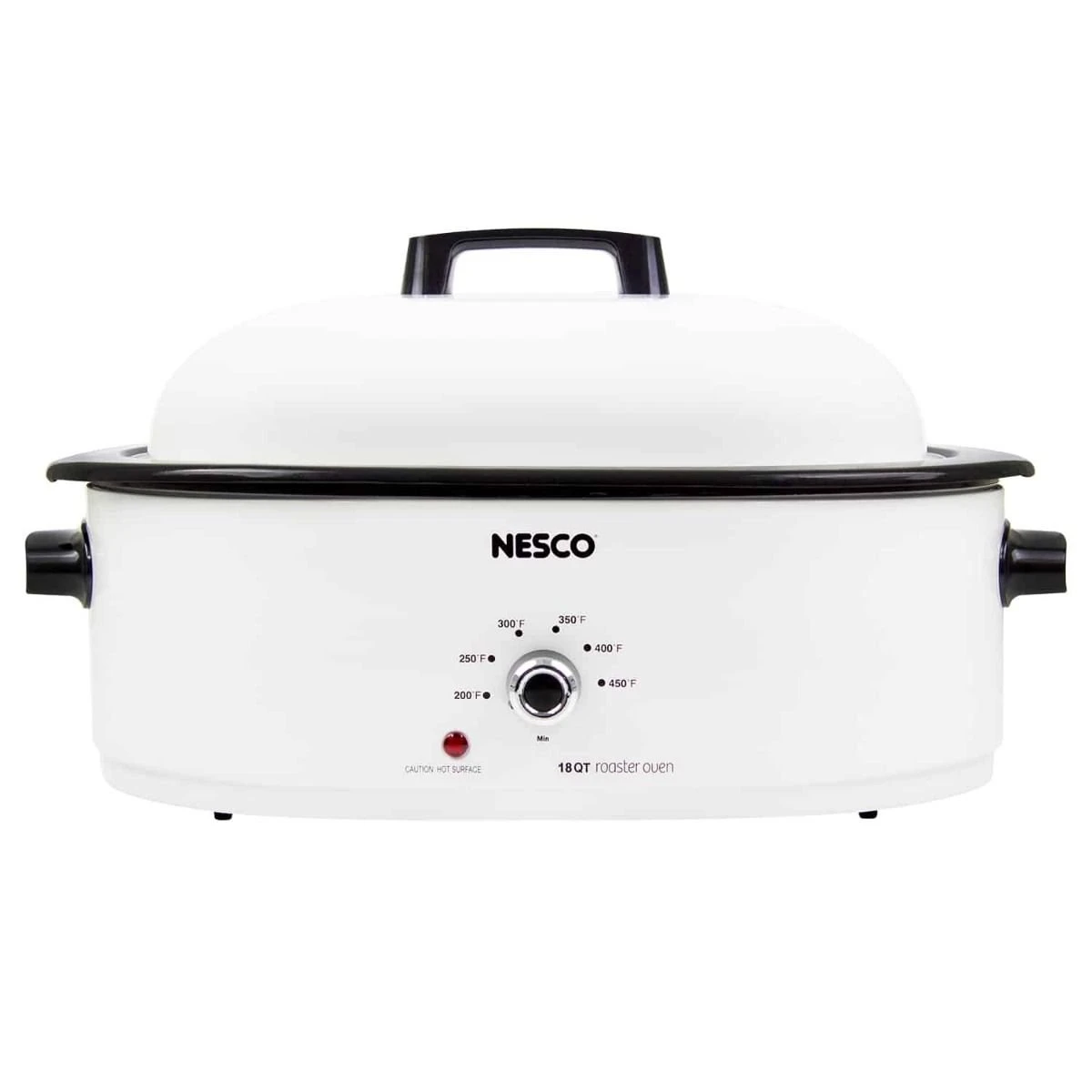 Prepare all your favorite meals quickly and hassle-free with the 18-Quart Roaster from Nesco. With a modern white exterior, this roaster is at home on any kitchen countertop and is designed to perform a versatile range of tasks including roasting, baking, steaming and slow cooking. The powerful 145050 watt base uses “Circle of Heat” technology to produce moist, even results every time, and the dial control allows you to precisely control the temperature between 200°F and 450°F. At 18-quarts, the removable porcelain cookwell is perfect for hosting large gatherings or attending potlucks. The enamel finish ensures that it’s nearly nonstick and easy to clean. Also included is a steel cooking rack with lift-out handles for baking and roasting. Stay-cool side handles make transporting this roaster from kitchen to table or even to events outside the home a breeze, allowing you to serve your delicious meals straight from the source! Whether you’re preparing your famous homemade chili, a mouthwatering pork roast or a delicious glazed ham, the Nesco 18-Quart Roaster is the perfect all-in-one appliance for any home!