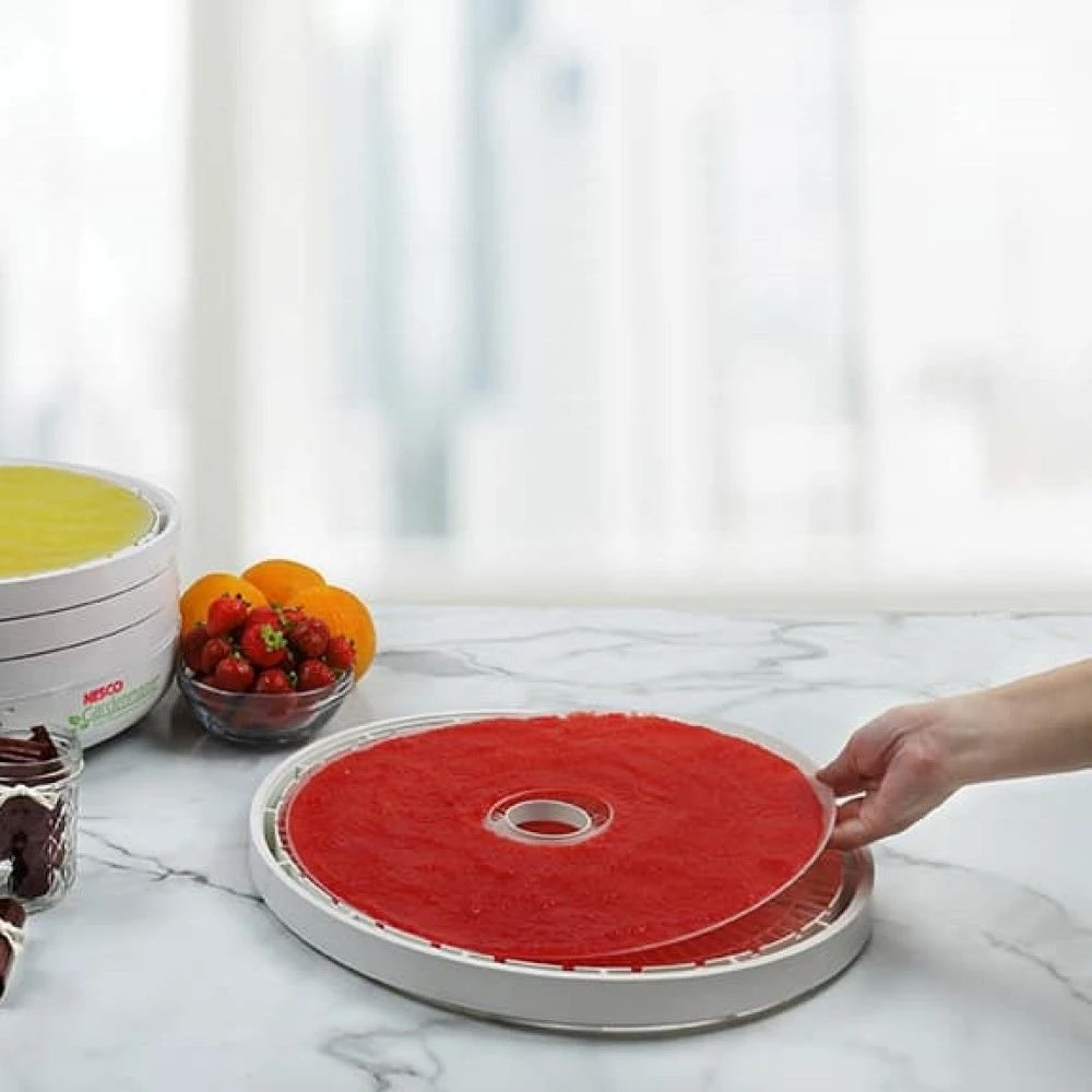 If you are using a Nesco Gardenmaster Dehydrator, are you getting the most optimal use of it if you’re not making fruit leathers and rolls? For those healthy and delicious snacks or treats, get yourself the Nesco American Harvest Dehydrator Fruit Roll Sheets Set of Two. Made from high-quality BPA-free plastic and reaching 15″ in diameter, these sheets are compatible with Nesco 80 & 1000 Series Dehydrators. These sheets also have a “No-Spill” lip that prevents spills, leaking, and other types of messes during the dehydration process. Perfect for drying liquids, making fruit leather, and catching drips for easier cleanup, you can make your fruit rolls without the additives, extra sugars, and preservatives found in store-bought fruit rolls. Each sheet also holds up to 3 cups of pureed fruit, allowing you to make plenty of fruit leather one sheet at a time. Easy to clean and made in the USA, the Nesco American Harvest Dehydrator Fruit Roll Sheets Set of Two will help you continue using your Nesco 80 or 1000 Series Dehydrators by unleashing their maximum potential!