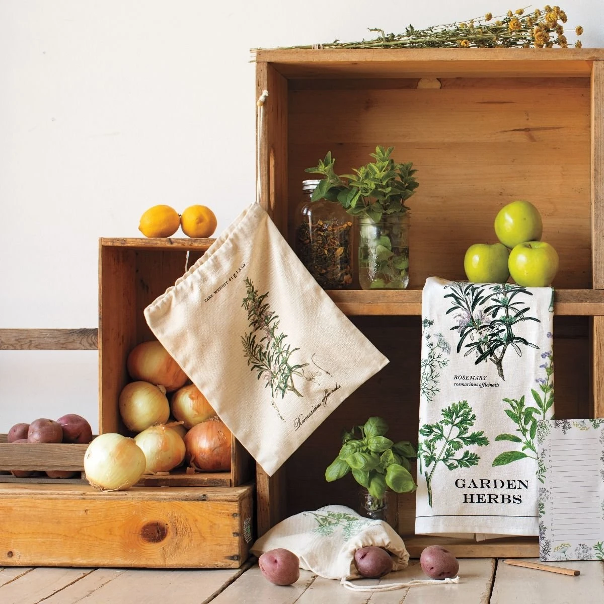 Spruce up you kitchen decor with the Garden Herbs Printed Dishtowel from Now Designs by Danica. This towel is printed with traditionally-styled, labeled drawings of flowering coriander, dill, sage, rosemary and thyme, bringing a sense of fresh country air, warm sunlight and simpler times into your home. The cotton is absorbent and non-abrasive for efficient drying. For easy care, machine wash warm and tumble dry on low; unlike dishtowels made from other materials, these cotton towels will retain their size and shape through repeated washings. Order this charming Now Designs by Danica Garden Herbs Printed Dishtowel for your kitchen today!