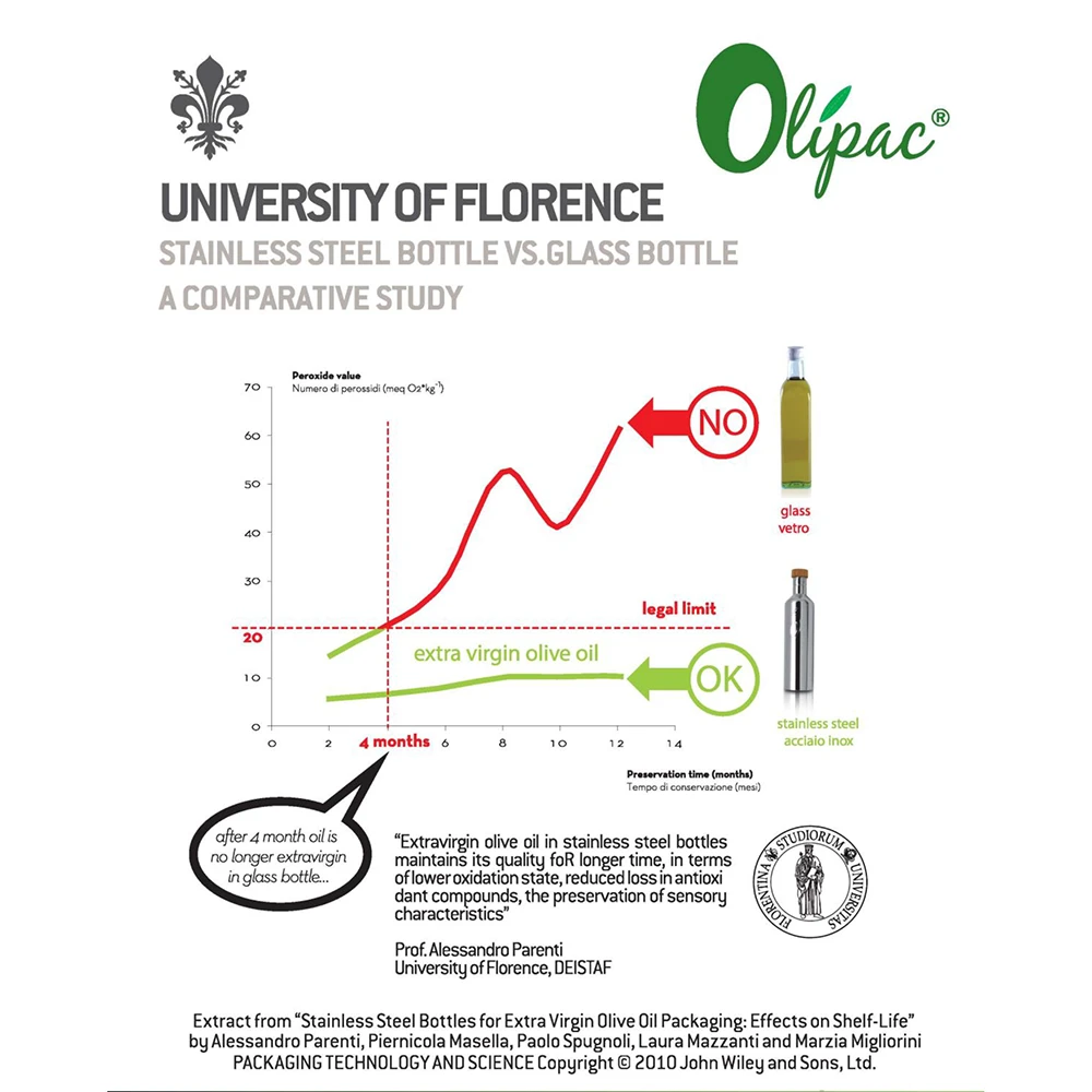 Olipac’s Tuscan roots influence the company’s passionate pursuit of the ideal methods and materials to preserve the traits of the finest olive oils. Research by the University of Florence has shown stainless steel to be a superior material for preserving the unique flavors and aromas of olive oil when compared to traditional glass bottles. Olipac’s stainless steel olive oil dispensers provide striking designs and patented construction methods to bring the finest flavors to your kitchen and table.
