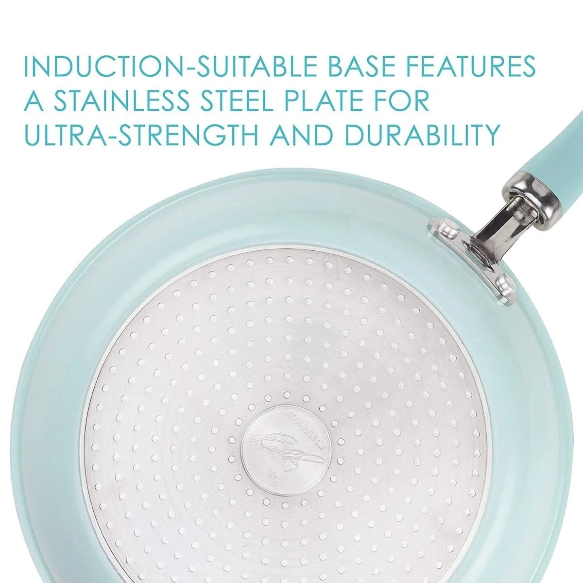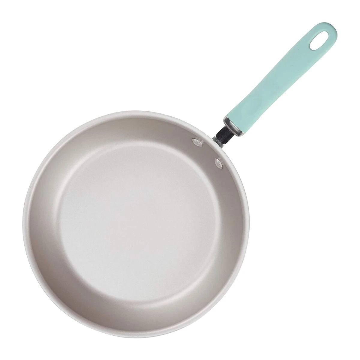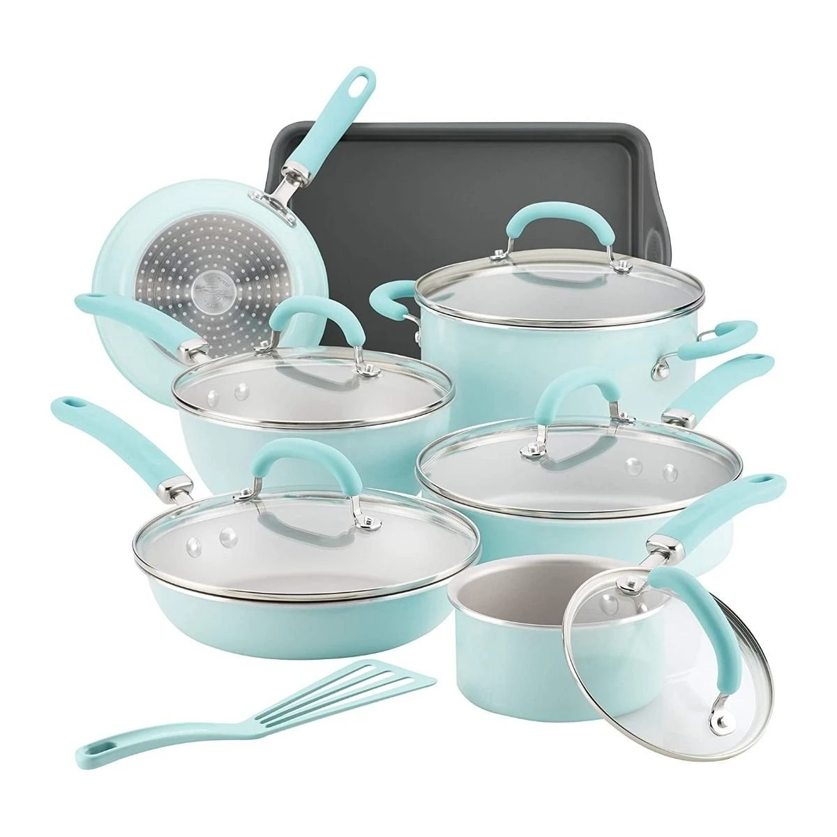 Made from durable aluminum and reinforced with a PremiumShield Technology enameled nonstick coating, the Rachael Ray 13-Piece Enameled Cookware Set will not diminish over time. Each cookware piece is crafted with flared rims for easy pouring and double-riveted stainless steel handles with silicone sleeves for a comfortable grip. The included lids are shatter-resistant with easy-to-grab silicone handles and lock in moisture and flavors while cooking or steaming. Easy and colorful, the Rachael Ray 13-Piece Enameled Cookware Set is perfect for those looking to upgrade their cookware or new homeowners starting their cookware collection!