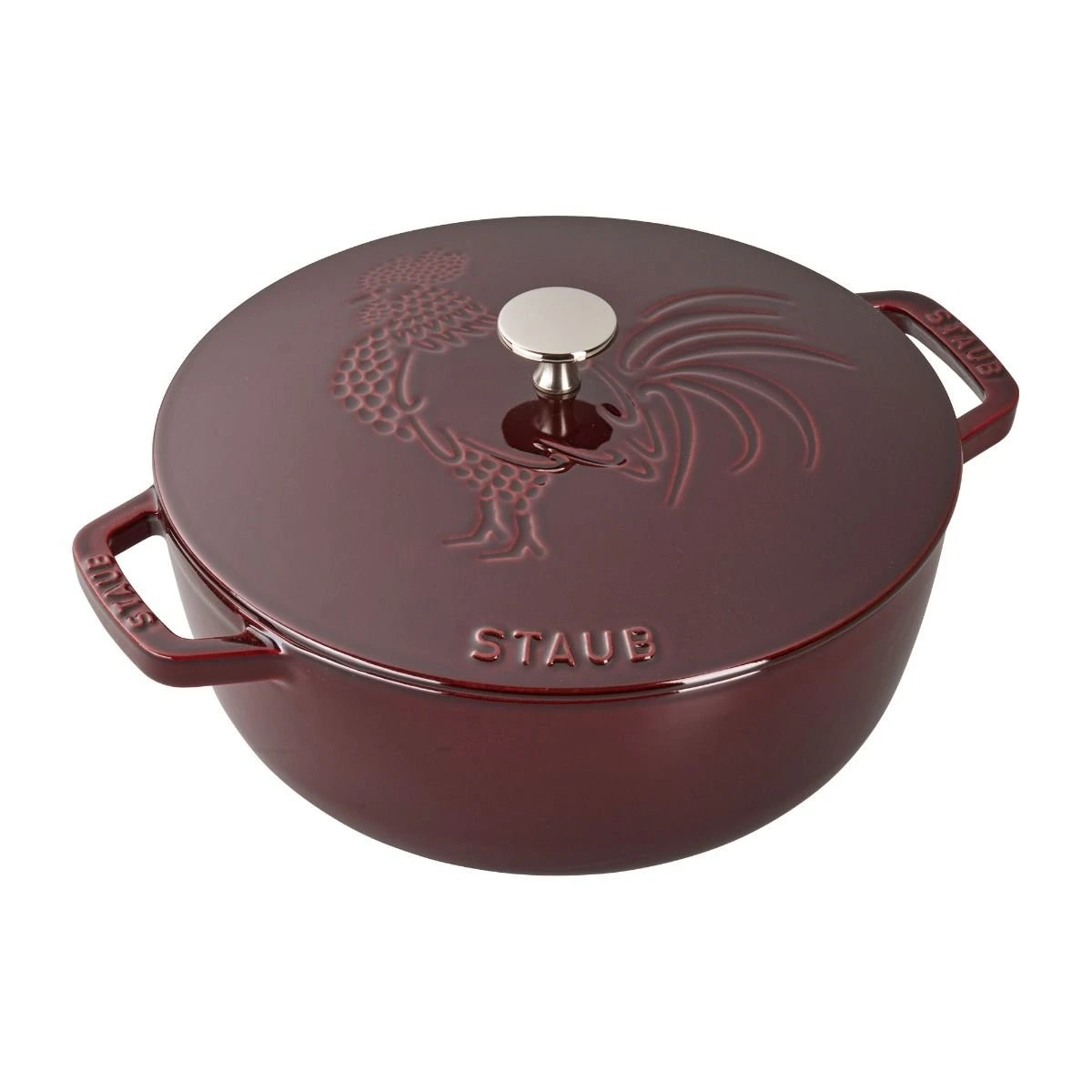 Cook hearty stews, savory casseroles, or delicious cobblers with Staub’s Essential 3.75 Qt Grenadine Cast Iron Rooster Cocotte/Dutch Oven! The traditional round design paired with a lid that has built-in Chistera spikes enables self-basting to continuously keep food moist. The easy-to-clean cast iron cookware distributes and retains heat and does not require seasoning. The matte black enamel interior heats and enhances caramelizing and is excellent for searing. The lovely rooster engraved on top is the perfect touch of character for your kitchen. Try your hand at ratatouille, risotto, or roasts in your very own Staub Essential 3.75 Qt Grenadine Cast Iron Rooster Cocotte/Dutch Oven!