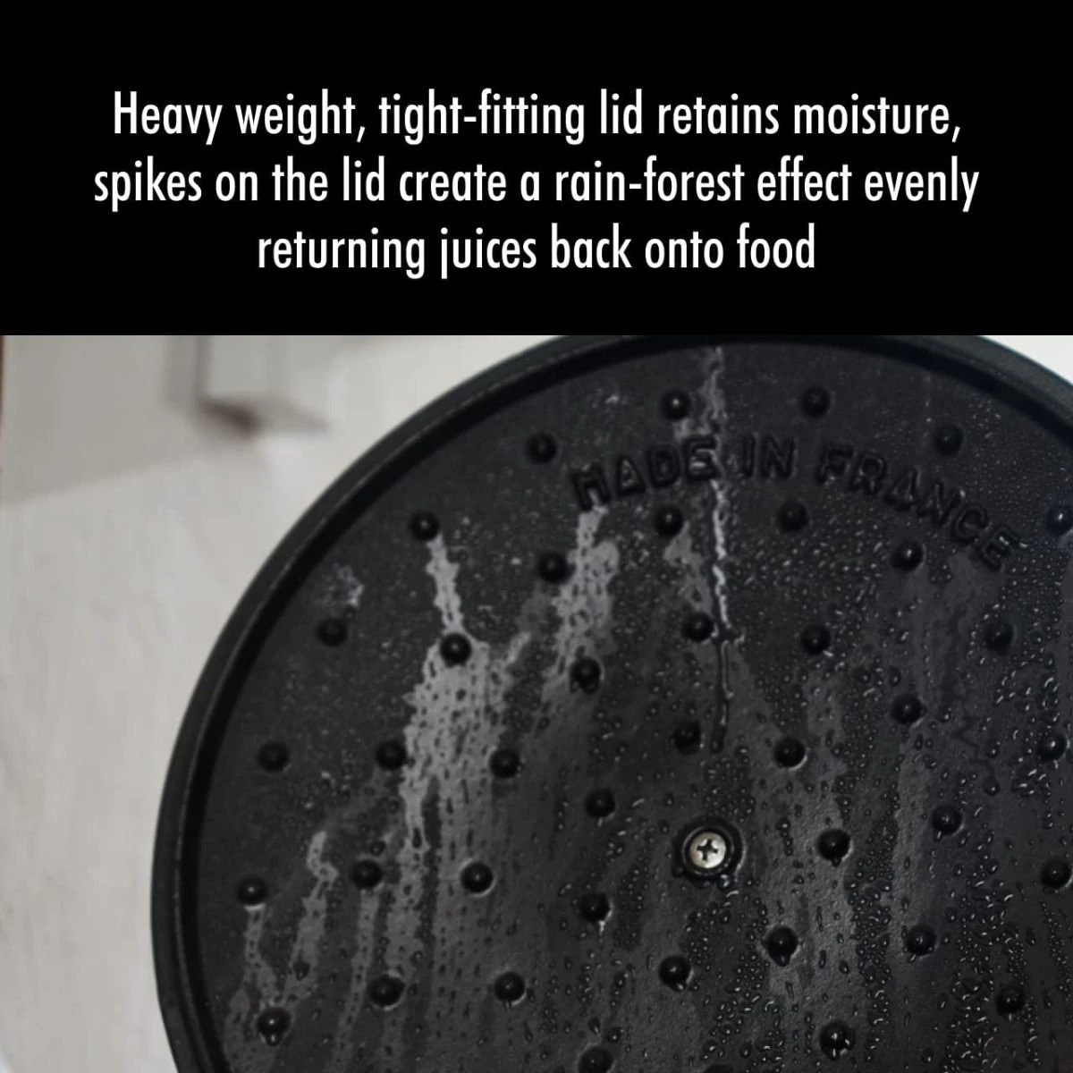 - Heavy weight, tight-fitting lid retains moisture, spikes on the lid create a rain-forest effect evenly returning juices back onto food