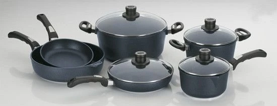 Woll Diamond Plus Induction cookware is made using nano technology to apply diamond-reinforced surfaces that are guaranteed not to blister, crack, bubble, or peel; these surfaces are so durable that they stand up to metal utensils and regular dishwasher cleaning. Each hand-cast aluminum cookware piece in this set is fitted with a metal base for use with induction cooktops, as well as all other gas, electric, ceramic, radiant, and halogen stoves. The Woll 10-Piece Diamond Plus Induction Cookware Set is safe for temperatures up to 500°F.